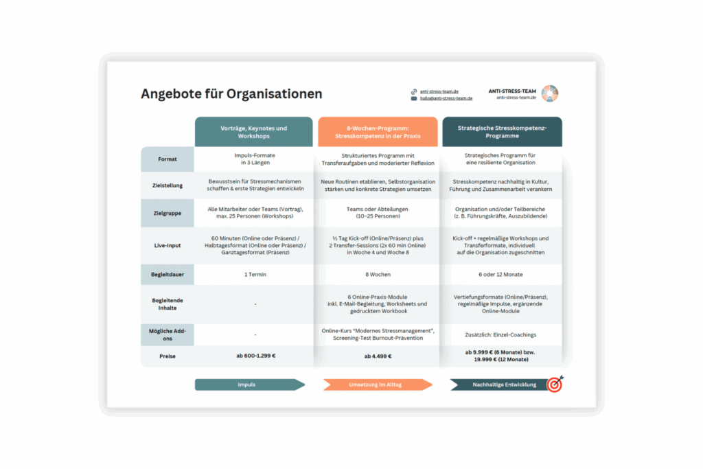 - Führungskräfte und Manager, die selbst Burnout vorbeugen und ihre Kompetenzen an ihr Team weitergeben möchten