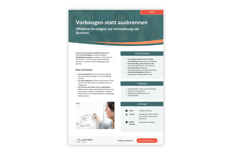 Ein Burnout-Seminar schafft Bewusstsein für frühzeitige Warnsignale, vermittelt mögliche Bewältigungsstrategien und trägt zur Prävention von Burnout bei.